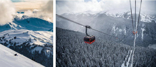 提起在BC省滑雪的旅途,惠斯勒黑梳山(Whistler Blackcomb)几乎是一个绕不开的名字。这里一定会刷新每一个滑雪者的认知和体验,两座巍峨山峰并肩矗立,雪原在视线尽头层层铺展,无论你滑向哪里,都会被这种尺度感包围。连接惠斯勒山与黑梳山的横渡峰顶缆车(PEAK 2 PEAK Gondola),是这片雪域最具标志性的体验之一。车厢缓缓升起,脚下的山谷逐渐拉开深度,森林与雪原在下方流动展开。缆车跨越两座山峰之间的空中距离,几分钟的行程像是一场悬浮在云端的旅行——抬头是连绵起伏的雪山天际线,低头则是静默而深邃的冬日山谷。